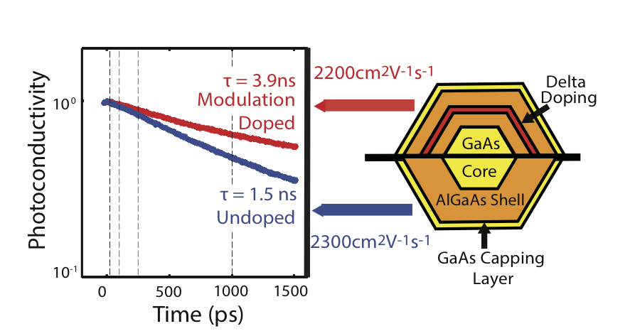 pdf ][ DOI:10.1021/acsnano.5b07579 ] Terahertz spectroscopy of GaAs nanowires with controlled n-type and p-type shell doping, to show enhanced lifetimes due to reduced surface recombination caused by doping-related band bending. |