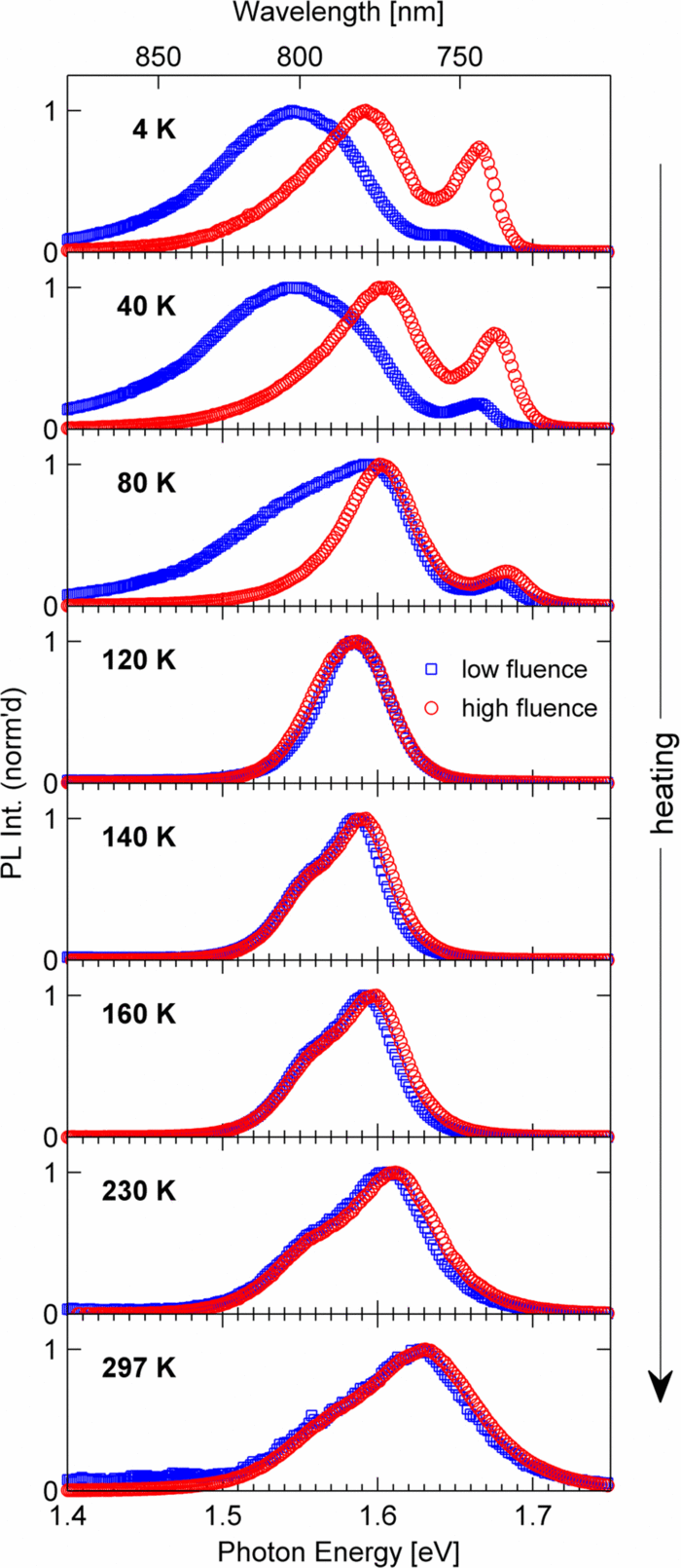 pdf ][ DOI:10.1063/1.4891595 ] we present a temperature-dependent study of optical absorption and photoluminescence (PL) emission of vapor-deposited organic-inorganic Perovskite semiconductors exploring the nature of recombination channels in the room- and the low-temperature phase of the material. |