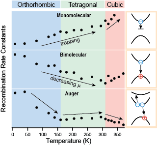 pdf ][ DOI:10.1002/adfm.201502340 ] The photoconductivity in CH3NH3PbI3 thin films is investigated from 8 K to 370 K across three structural phases, and analysis of the charge-carrier recombination dynamics reveals a variety of starkly differing recombination mechanisms. |
