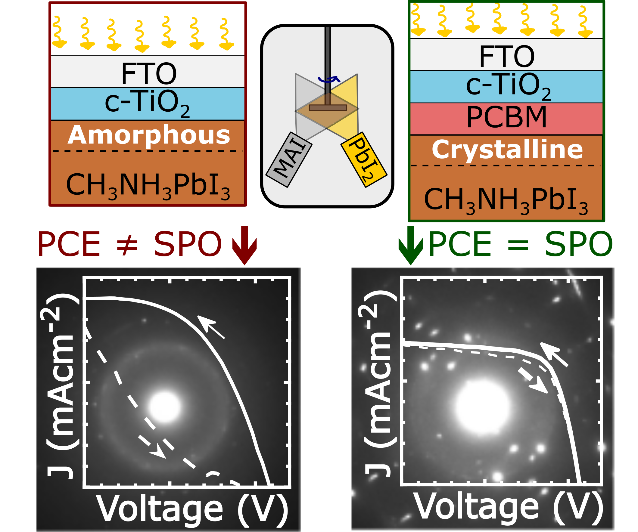 pdf ][ DOI:10.1002/aelm.201600470 ] We use interface engineering to produce highly crystalline perovskite hysteresis-free evaporated planar heterojunction solar cells. TEM reveals that poor interfaces leads to amorphous regions of MAPbI3, hysteresis and poor stabilised power conversion efficiencies. |